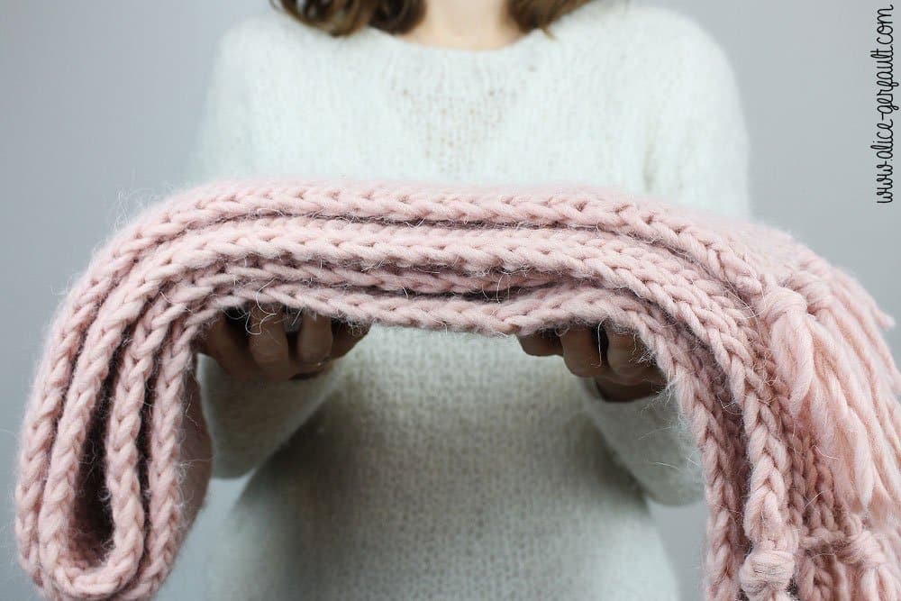 Répétez ces deux rangs encore et encore, jusqu’à obtenir une belle écharpe de 2,6 mètres ou la longueur qui vous plaît. Une fois la taille atteinte, rabattez souplement les mailles pour éviter que l’extrémité ne serre trop.